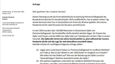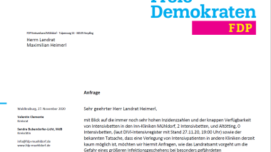 Am 27.11.20 haben unsere Kreisräte MdB Sandra-Bubendorfer-Licht und Valentin Clemente eine Anfrage an Landrat Maximilian Heimerl zur Umsetzung von Schutzmaßnahmen für vulnerable Gruppen in der Corona-Pandemie und zur Arbeit der Contact-Tracing-Teams (CCT) gestellt.